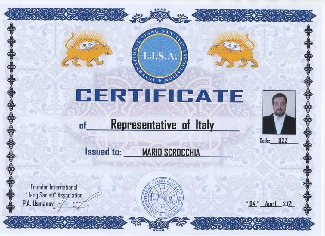 Il presidente mondiale Mr. Aziz Djurabaev ha delegato Mr. Mario Scrocchia, segretario e Vice-presidente di IKC World come rappresentante di IJSA Italia. INTERNATIONAL JANG SAN’ATI ASSOCIATION E’ RICONOSCIUTO DA WOMAU (World Martial Arts Union)